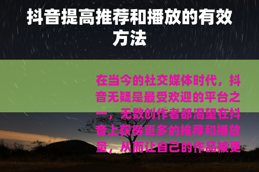 在当今的社交媒体时代,抖音无疑是最受欢迎的平台之一,无数创作者都渴望在抖音上获得更多的推荐和播放量,从而让自己的作品被更多人看到,以下是一些能够帮助你提高抖音推荐和播放的实用方法。 质量是关键,确保你的视频内容具有独特性和吸引力,无论是搞笑、知识分享、美食制作还是生活趣事,都要找到一个能让观众产生兴趣的点,在拍摄前精心策划脚本,让视频有一个清晰的主题和流畅的情节,避免内容过于杂乱无章,注意视频的画质和音质,尽量使用高清设备拍摄,保证画面清晰、稳定,声音清晰可听,这样能给观众带来更好的观看体验。