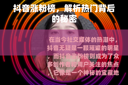 在当今社交媒体的热潮中,抖音无疑是一颗璀璨的明星,而抖音涨粉榜则成为了众多创作者和用户关注的焦点,它像是一个神秘的宝藏地图,指引着人们去探寻抖音世界中那些快速涨粉的成功之路。