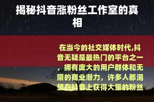 在当今的社交媒体时代,抖音无疑是最热门的平台之一,拥有庞大的用户群体和无限的商业潜力,许多人都渴望在抖音上获得大量的粉丝,以实现自己的各种目标,无论是个人品牌推广、产品销售还是单纯的追求人气,在这种需求的推动下,抖音涨粉丝工作室应运而生。