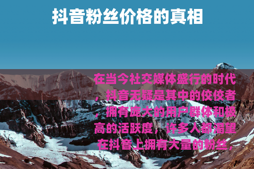 在当今社交媒体盛行的时代,抖音无疑是其中的佼佼者,拥有庞大的用户群体和极高的活跃度,许多人都渴望在抖音上拥有大量的粉丝,以提升自己的影响力和实现各种商业或个人目标,抖音粉丝到底多少钱呢?