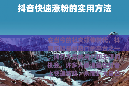 在当今的社交媒体时代,抖音无疑是最热门的平台之一,拥有大量的用户和无限的机会,许多人都渴望在抖音上快速涨粉,从而扩大自己的影响力和实现各种目标,抖音要怎么快速涨粉丝呢?以下是一些实用的方法。