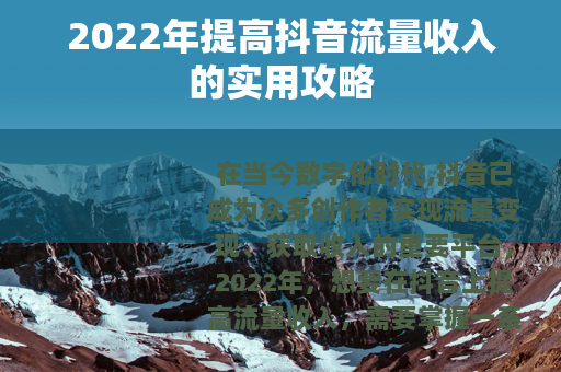 在当今数字化时代,抖音已成为众多创作者实现流量变现、获取收入的重要平台,2022年,想要在抖音上提高流量收入,需要掌握一系列有效的策略和方法,以下是一些关键要点,助你在抖音的流量海洋中乘风破浪,实现收入的增长。
