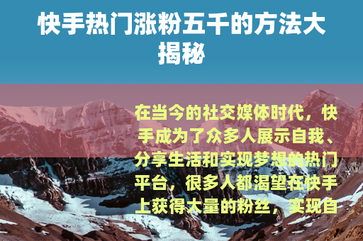 在当今的社交媒体时代,快手成为了众多人展示自我、分享生活和实现梦想的热门平台,很多人都渴望在快手上获得大量的粉丝,实现自己的影响力提升,就来为大家分享一些能让你在快手上热门涨粉五千的实用方法。 的质量是至关重要的,你需要提供有价值、有趣、独特且能引起观众共鸣的视频内容,无论是搞笑段子、美食制作、才艺表演还是知识分享,都要确保你的视频在众多同类内容中脱颖而出,你可以通过独特的拍摄手法,如运用创意的镜头切换、独特的光影效果等,让你的视频在视觉上更具吸引力,在视频的剪辑上也要下功夫,使视频节奏紧凑、流畅,不拖沓,这样才能更好地抓住观众的注意力,让他们愿意完整地看完你的视频,从而增加视频的完播率,这对于上热门涨粉是非常关键的。