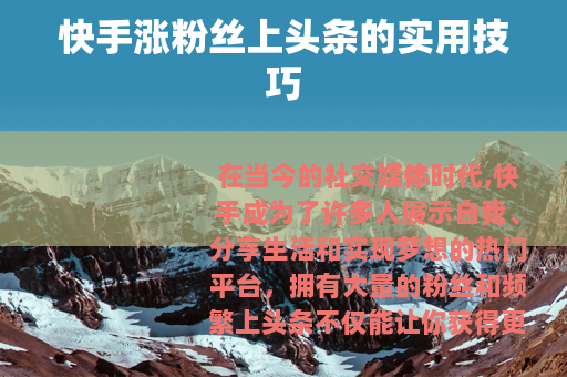 在当今的社交媒体时代,快手成为了许多人展示自我、分享生活和实现梦想的热门平台,拥有大量的粉丝和频繁上头条不仅能让你获得更多的关注,还可能为你带来各种机会,下面就为大家分享一些快手涨粉丝上头条的技巧。