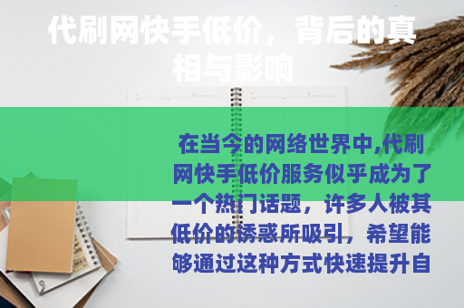 在当今的网络世界中,代刷网快手低价服务似乎成为了一个热门话题,许多人被其低价的诱惑所吸引,希望能够通过这种方式快速提升自己在快手平台上的人气和影响力,在我们深入了解之后,会发现这背后其实有着诸多复杂的情况和潜在的问题。