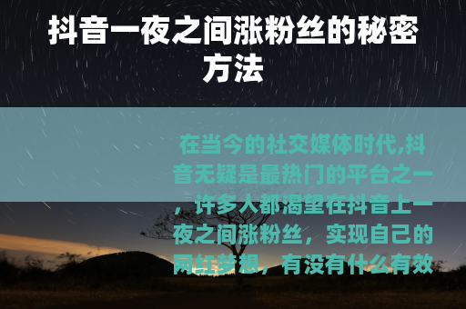 在当今的社交媒体时代,抖音无疑是最热门的平台之一,许多人都渴望在抖音上一夜之间涨粉丝,实现自己的网红梦想,有没有什么有效的方法可以帮助我们在抖音上快速获得大量粉丝呢? 是关键,要制作出高质量、有吸引力的视频内容,这意味着你的视频要具有独特性和创新性,能够在众多的抖音视频中脱颖而出,可以从自己的兴趣爱好、特长或者当下热门的话题入手,挖掘出一些新颖的角度,让观众眼前一亮,如果你擅长烹饪,那么可以制作一系列精美的美食制作视频,详细展示每一个步骤和独特的烹饪技巧,吸引美食爱好者的关注。