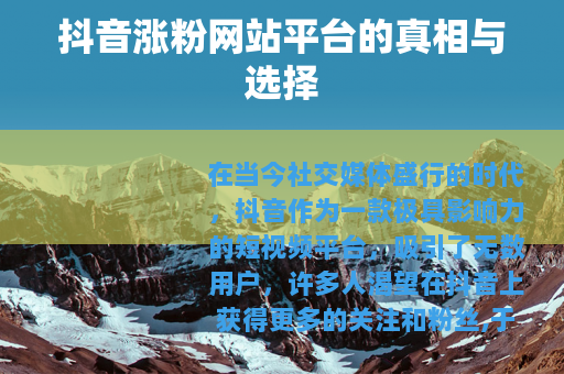 在当今社交媒体盛行的时代,抖音作为一款极具影响力的短视频平台,吸引了无数用户,许多人渴望在抖音上获得更多的关注和粉丝,于是抖音涨粉网站平台应运而生。