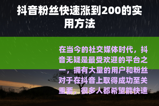 在当今的社交媒体时代,抖音无疑是最受欢迎的平台之一,拥有大量的用户和粉丝对于在抖音上取得成功至关重要,很多人都希望能快速将自己的抖音粉丝涨到200 ,以下是一些有效的方法。