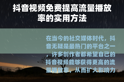 通过以上这些方法的综合运用,你就有机会在不花费任何费用的情况下,提高抖音视频的流量播放率,让更多的人看到你的精彩作品,在抖音这个大舞台上收获更多的关注和喜爱。