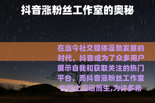 在当今社交媒体蓬勃发展的时代,抖音成为了众多用户展示自我和获取关注的热门平台,而抖音涨粉丝工作室也随之应运而生,为许多希望在抖音上快速积累粉丝的用户提供了一种途径。
