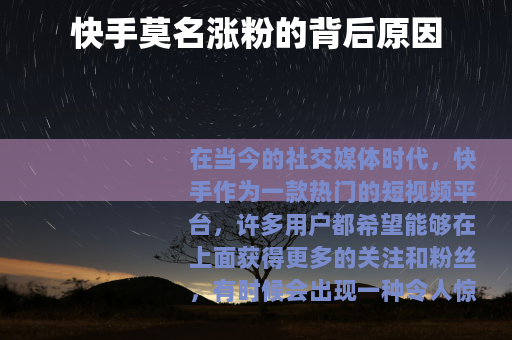 在当今的社交媒体时代,快手作为一款热门的短视频平台,许多用户都希望能够在上面获得更多的关注和粉丝,有时候会出现一种令人惊喜又疑惑的情况,那就是快手账号莫名地涨粉,这背后究竟有着怎样的原因呢?