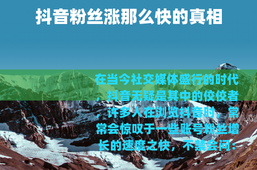 在当今社交媒体盛行的时代,抖音无疑是其中的佼佼者,许多人在浏览抖音时,常常会惊叹于一些账号粉丝增长的速度之快,不禁会问:抖音粉丝涨那么快是真的吗?