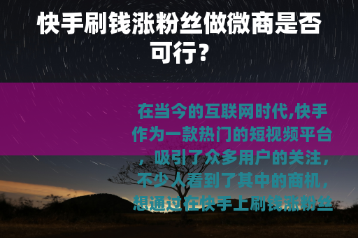在当今的互联网时代,快手作为一款热门的短视频平台,吸引了众多用户的关注,不少人看到了其中的商机,想通过在快手上刷钱涨粉丝来做微商,那么这种方式到底行不行呢?