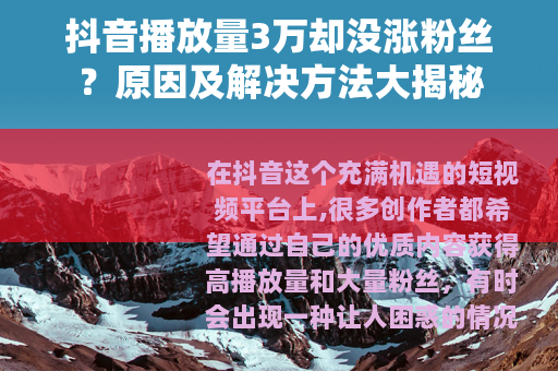 在抖音这个充满机遇的短视频平台上,很多创作者都希望通过自己的优质内容获得高播放量和大量粉丝,有时会出现一种让人困惑的情况,那就是播放量达到了3万,但粉丝数量却没有明显增长,这究竟是怎么回事呢?