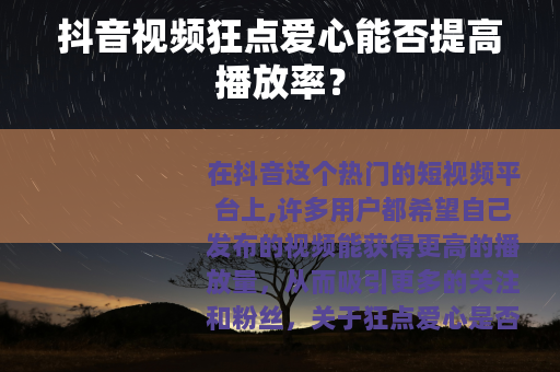 在抖音这个热门的短视频平台上,许多用户都希望自己发布的视频能获得更高的播放量,从而吸引更多的关注和粉丝,关于狂点爱心是否会提高视频播放率的问题,引发了不少人的讨论。
