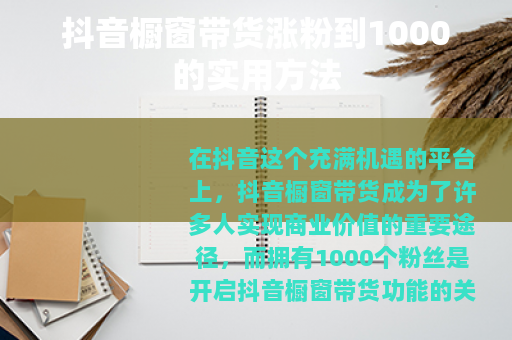 通过以上这些方法的综合运用,只要你坚持不懈地努力,就有很大机会在抖音上成功涨粉到1000,开启自己的抖音橱窗带货之路,在这个充满活力的平台上实现自己的商业目标。