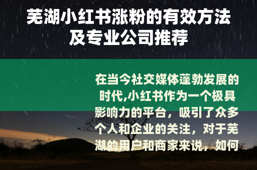 在当今社交媒体蓬勃发展的时代,小红书作为一个极具影响力的平台,吸引了众多个人和企业的关注,对于芜湖的用户和商家来说,如何在小红书上实现涨粉成为了一个热门话题。