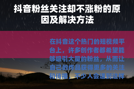 抖音粉丝关注却不涨粉是一个需要我们认真对待的问题,通过分析原因并采取相应的解决措施,我们可以不断优化自己的账号运营,提高粉丝的实际增长数量,在抖音平台上获得更好的发展。