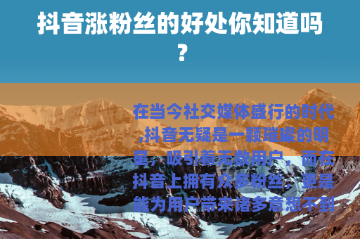 在当今社交媒体盛行的时代,抖音无疑是一颗璀璨的明星,吸引着无数用户,而在抖音上拥有众多粉丝,更是能为用户带来诸多意想不到的好处。