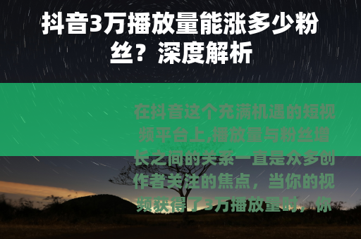 在抖音这个充满机遇的短视频平台上,播放量与粉丝增长之间的关系一直是众多创作者关注的焦点,当你的视频获得了3万播放量时,你可能会好奇究竟能涨多少粉丝呢?