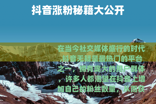 在当今社交媒体盛行的时代,抖音无疑是最热门的平台之一,拥有庞大的用户群体,许多人都渴望在抖音上增加自己的粉丝数量,从而获得更多的关注和影响力,抖音怎么涨粉丝数量呢?以下是一些实用的方法。