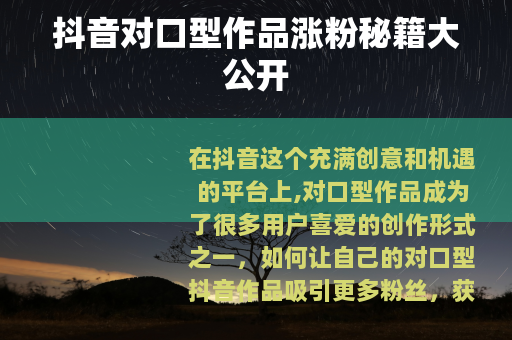 要想让自己的对口型抖音作品涨粉,需要在多个方面下功夫,不断优化和提升自己的创作水平和运营能力,相信通过努力,你一定能在抖音上收获一大批忠实的粉丝,让自己的对口型作品获得更多的喜爱和认可。