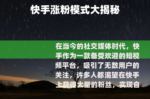 在当今的社交媒体时代,快手作为一款备受欢迎的短视频平台,吸引了无数用户的关注,许多人都渴望在快手上获得大量的粉丝,实现自己的社交价值和商业目标,快手的涨粉模式究竟是怎样的呢? 是快手涨粉的核心,用户需要创作出具有独特性、趣味性和实用性的短视频,无论是搞笑幽默的段子、感人至深的故事,还是专业知识的分享、精彩的才艺表演,只要能引起观众的共鸣和兴趣,就有可能获得大量的点赞、评论和分享,从而吸引更多的粉丝关注,一些美食博主通过展示精美的菜肴制作过程,以及分享独特的烹饪技巧,吸引了众多美食爱好者的关注,粉丝数量不断攀升。