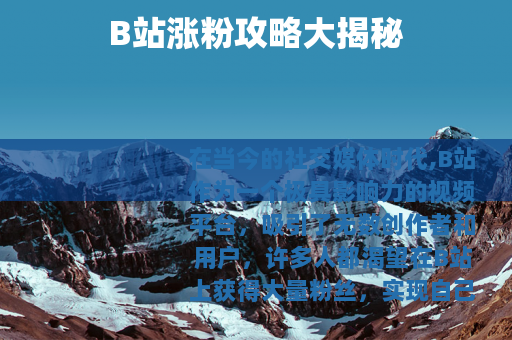 在当今的社交媒体时代,B站作为一个极具影响力的视频平台,吸引了无数创作者和用户,许多人都渴望在B站上获得大量粉丝,实现自己的创作价值和影响力,B站到底怎么涨粉呢?以下是一些实用的方法。 质量是关键,要制作出有吸引力、有价值的视频内容,无论是有趣的搞笑视频、深度的知识讲解,还是精彩的生活记录,都要确保能引起观众的兴趣,在选题上,可以关注当下热门话题和用户的兴趣点,这样更容易被搜索到和推荐,要注重视频的制作水平,包括画面质量、剪辑效果、音频清晰度等,给观众带来良好的观看体验。