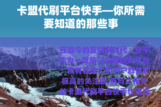 在当今的互联网时代,快手作为一款热门的短视频平台,拥有着庞大的用户群体和极高的关注度,而与之相关的卡盟代刷平台快手也逐渐进入了人们的视野。