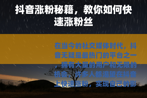 在当今的社交媒体时代,抖音无疑是最热门的平台之一,拥有大量的用户和无限的机会,许多人都渴望在抖音上快速涨粉,实现自己的影响力和价值,如何在抖音上涨粉丝最快呢?以下是一些实用的方法。