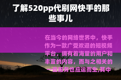 在当今的网络世界中,快手作为一款广受欢迎的短视频平台,拥有着海量的用户和丰富的内容,而与之相关的一些服务也应运而生,其中就包括520pp代刷网快手这样的平台。