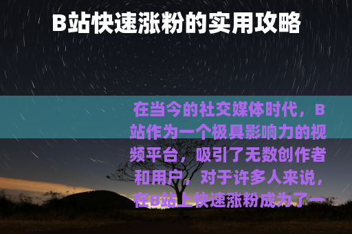 在当今的社交媒体时代,B站作为一个极具影响力的视频平台,吸引了无数创作者和用户,对于许多人来说,在B站上快速涨粉成为了一个热门话题,如何在B站快速涨粉呢?以下是一些实用的方法。 质量是关键,要制作出高质量、有吸引力的视频内容,这意味着你需要有独特的创意和观点,能够在众多视频中脱颖而出,无论是搞笑、知识科普、美食制作还是游戏攻略等各种类型的视频,都要确保其具有趣味性、实用性或情感共鸣,让观众在观看后能有所收获或感到愉悦,从而愿意关注你的账号并期待你的下一次更新。