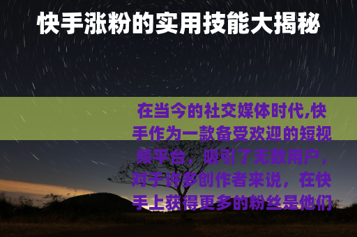 在当今的社交媒体时代,快手作为一款备受欢迎的短视频平台,吸引了无数用户,对于许多创作者来说,在快手上获得更多的粉丝是他们努力的目标之一,有哪些实用的快手涨粉技能呢? 创作是关键,要制作出高质量、有吸引力的视频内容,这意味着要找到自己擅长且有市场需求的领域,比如美食制作、美妆教程、搞笑段子等,专注于一个特定的领域,能够让你的账号更具专业性和辨识度,从而吸引到精准的粉丝群体,在创作内容时,要注重视频的画面质量,确保光线充足、画面清晰稳定,同时声音也要清晰可听。