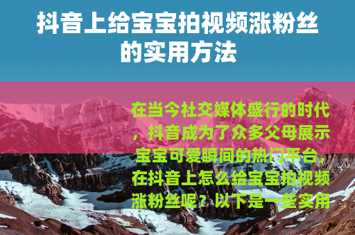 在当今社交媒体盛行的时代,抖音成为了众多父母展示宝宝可爱瞬间的热门平台,在抖音上怎么给宝宝拍视频涨粉丝呢?以下是一些实用的方法。