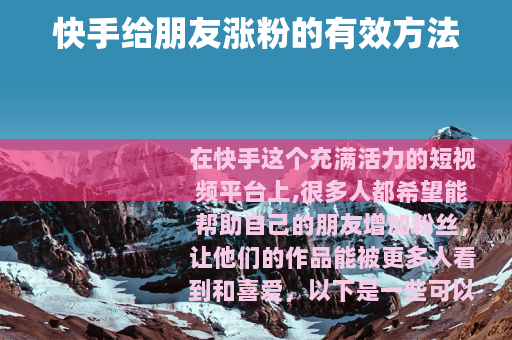 在快手上帮助朋友涨粉需要多方面的努力和策略,通过积极互动、创作优质内容、利用平台功能以及开展合作等方式,能有效地提升朋友的粉丝数量,让他们在快手的创作之旅更加顺利和成功。