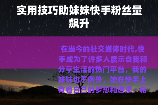 在当今的社交媒体时代,快手成为了许多人展示自我和分享生活的热门平台,我的妹妹也不例外,她在快手上有着自己的梦想和追求,希望能够吸引更多的粉丝,让更多的人看到她的才华和魅力,我就来给大家分享一些帮助妹妹在快手涨粉丝的有效方法。 是关键,妹妹需要确保她发布的视频具有独特性和吸引力,可以是有趣的生活趣事、精彩的才艺表演,或者是实用的生活小窍门等等,妹妹擅长绘画,那么她可以制作一系列绘画教程的视频,从简单的素描到色彩斑斓的油画,详细地展示绘画过程和技巧,这样能够吸引到对绘画感兴趣的用户关注她的快手账号。