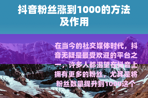 在当今的社交媒体时代,抖音无疑是最受欢迎的平台之一,许多人都渴望在抖音上拥有更多的粉丝,尤其是将粉丝数量提升到1000这个重要的节点,抖音粉丝怎么涨到1000呢?
