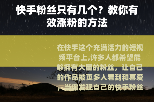 在快手这个充满活力的短视频平台上,许多人都希望能够拥有大量的粉丝,让自己的作品被更多人看到和喜爱,当你发现自己的快手粉丝只有几个时,可能会感到有些沮丧,别担心,今天就来给大家分享一些实用的方法,帮助你在快手上实现粉丝增长。