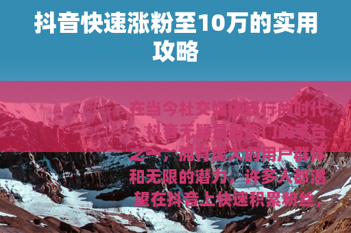 在当今社交媒体盛行的时代,抖音无疑是最热门的平台之一,拥有庞大的用户群体和无限的潜力,许多人都渴望在抖音上快速积累粉丝,实现自己的影响力和价值提升,如何在抖音快速涨10万粉丝呢?以下是一些经过实践验证的有效方法。