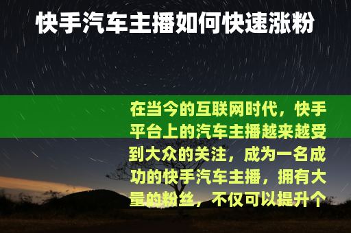在当今的互联网时代,快手平台上的汽车主播越来越受到大众的关注,成为一名成功的快手汽车主播,拥有大量的粉丝,不仅可以提升个人影响力,还能带来诸多商业机会,快手汽车主播该如何实现涨粉呢? 的专业性是关键,汽车主播需要对汽车行业有深入的了解,包括各种车型的特点、性能、配置等,在直播或制作视频时,能够准确、详细地为观众介绍汽车相关知识,解答他们的疑问,这样才能赢得观众的信任和认可,可以针对不同预算、不同需求的用户推荐合适的车型,或者分享一些汽车保养、维修的实用技巧。