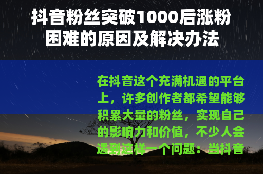 抖音粉丝达到1000后涨粉不动是一个常见的问题,但只要我们找到原因,并采取相应的解决措施,不断优化自己的内容和运营方式,就能够突破瓶颈,实现粉丝的持续增长,在抖音平台上获得更大的成功。