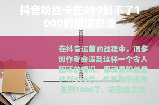在抖音运营的过程中,很多创作者会遇到这样一个令人困惑的情况,那就是粉丝量达到999后,似乎就很难再涨到1000了,这到底是怎么回事呢?这里面是有一些原因和相应的解决办法的。