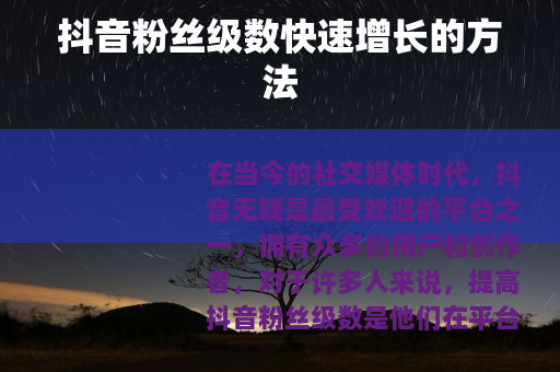 在当今的社交媒体时代,抖音无疑是最受欢迎的平台之一,拥有众多的用户和创作者,对于许多人来说,提高抖音粉丝级数是他们在平台上努力追求的目标之一,究竟有哪些有效的方法可以帮助我们实现抖音粉丝级数的快速增长呢? 质量是关键,要创作出有趣、有价值且独特的视频内容,了解你的目标受众,关注他们的兴趣点和需求,这样才能制作出能够吸引他们的视频,如果你发现你的目标受众对美食感兴趣,那么你可以制作各种美食制作教程、美食探店等相关视频,用精彩的画面和生动的解说,让观众在观看视频的过程中获得乐趣和知识,从而增加他们对你的关注和喜爱。