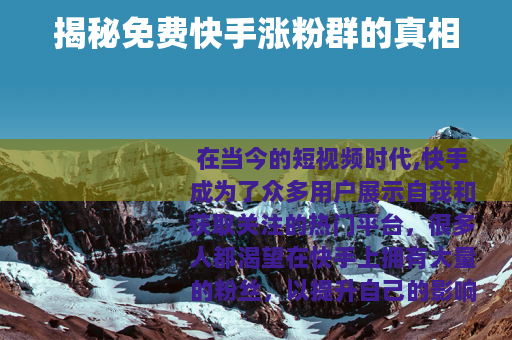 在当今的短视频时代,快手成为了众多用户展示自我和获取关注的热门平台,很多人都渴望在快手上拥有大量的粉丝,以提升自己的影响力和创作价值,免费快手涨粉群便应运而生,吸引了不少人的目光。