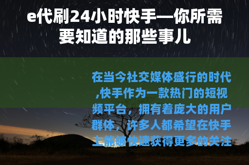 在当今社交媒体盛行的时代,快手作为一款热门的短视频平台,拥有着庞大的用户群体,许多人都希望在快手上能够快速获得更多的关注、点赞和粉丝,从而提升自己的影响力,而“e代刷24小时快手”这样的服务也随之出现。