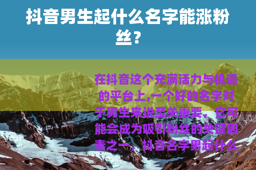 在抖音这个充满活力与机遇的平台上,一个好的名字对于男生来说至关重要,它可能会成为吸引粉丝的关键因素之一,抖音名字男起什么能涨粉丝呢?