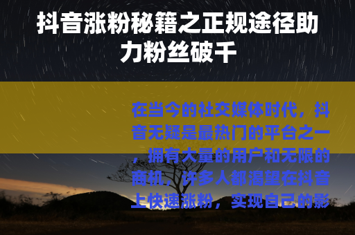 在当今的社交媒体时代,抖音无疑是最热门的平台之一,拥有大量的用户和无限的商机,许多人都渴望在抖音上快速涨粉,实现自己的影响力和商业价值,在追求涨粉的道路上,我们要坚决摒弃一些不正当的方法,选择合法合规且有效的途径。