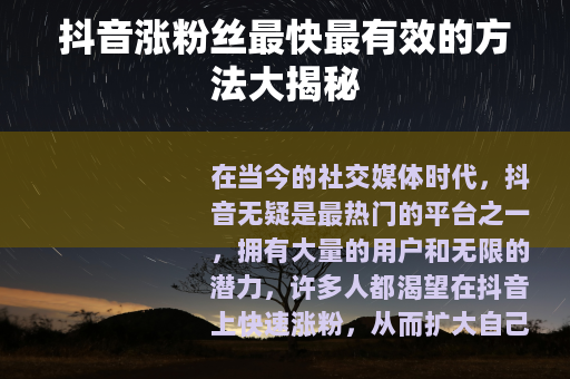 在当今的社交媒体时代,抖音无疑是最热门的平台之一,拥有大量的用户和无限的潜力,许多人都渴望在抖音上快速涨粉,从而扩大自己的影响力,实现各种目标,究竟有哪些抖音涨粉丝最快最有效的方法呢? 是关键,要确保你的视频具有独特性、趣味性和实用性,可以从自己擅长的领域出发,比如美食、旅游、时尚、健身等,制作出专业且吸引人的视频内容,如果你擅长烹饪,那么可以制作详细的美食制作教程,展示独特的烹饪技巧和美味的菜肴,让观众在观看的过程中既能学到知识,又能感受到美食的诱惑,从而吸引他们关注你的账号。