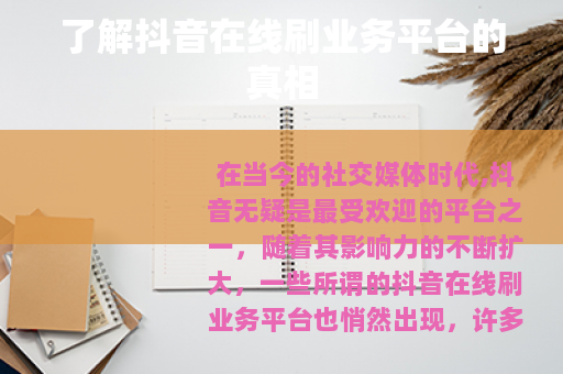 在当今的社交媒体时代,抖音无疑是最受欢迎的平台之一,随着其影响力的不断扩大,一些所谓的抖音在线刷业务平台也悄然出现。