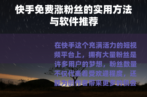 在快手这个充满活力的短视频平台上,拥有大量粉丝是许多用户的梦想,粉丝数量不仅代表着受欢迎程度,还能为创作者带来更多的机会和收益,有没有什么好的方法可以在快手上免费涨粉丝呢?今天就来给大家分享一些实用的技巧以及相关的软件推荐。